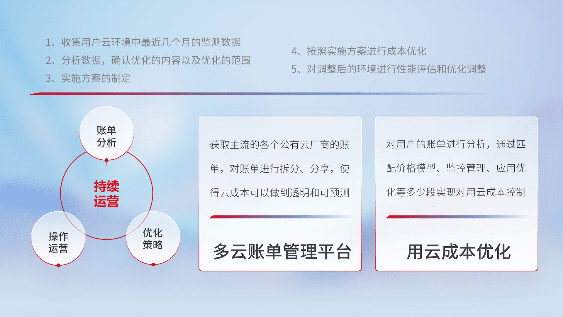 通过多云纳管,,,以统一的资源数据模型把客户的云资源进行抽象和封装,,进而实现对多云资源的统一操作,,,保障云资源管理的可靠性、、、稳定性与可用性。。。。量身定制化运维内容,,,,配置、、、、开发运维、、补丁管理、、、备份、、、、监控、、、认证和访问管理、、、、审计和日常巡检等,,,保障在用云过程中的可靠度,,,稳定度以及高可用率。。。