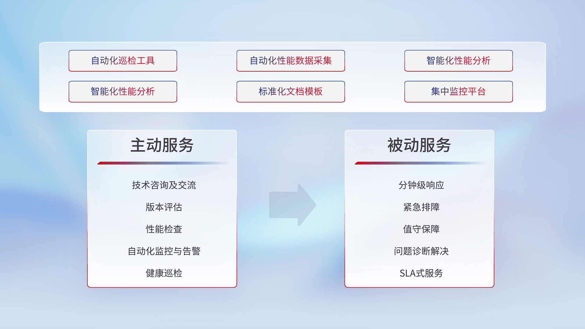 智能化工具和标准化文档,,,保障服务质量,,提供主动服务(包含技术咨询、、版本评估、、性能检查、、、自动化监控与告警、、、健康巡检)和被动服务包含(分钟级响应、、、紧急排障、、值守保障、、、问题诊断解决、、、、SLA服务)。。